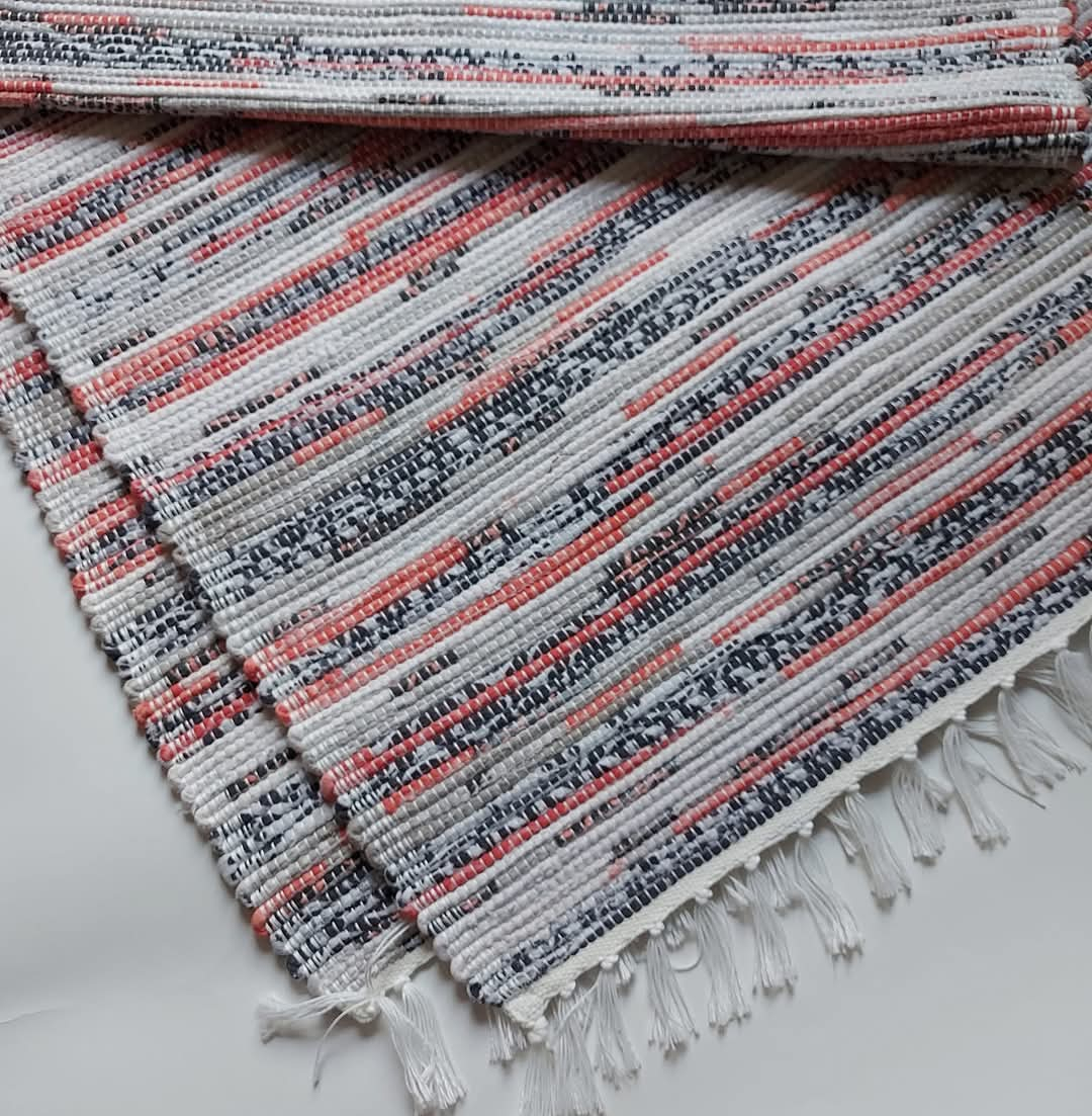 Preș țesut manual la război din 100% bumbac reciclat din lenjerii de pat, tăiate și țesute.
